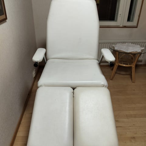2021 ostettu jalkahoitotuoli Cefe. 1 moottori korkeuden säätöön. Manuaalisilla jalkapedaaleilla selkänojan säätö ja kallistus. Jalkatuet säädetään vivuista manuaalisesti. Voi käyttää myös muuhun kauneudenhoitoon ja hierontaan. Mekanismi toimii hyvin ja muutoin siisti, vain istuinosassa kulumaa. Sijaitsee Oulussa Limingantullissa ja nouto tulisi tapahtua aikaisintaan viikolla 51 ja viimeistään viikolla 52.
