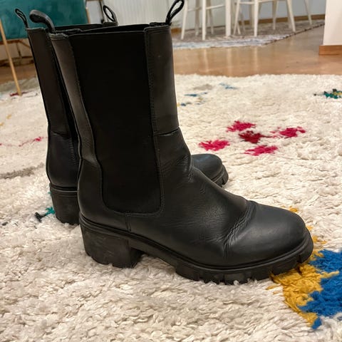 Tanskalaisen Pieces merkin nahka saappaat, joissa vuori varren puolesta välistä alaspäin. Korko 3 cm, varsi 39 cm. Nouto Oulunkylässä tai Kalasatamasta.