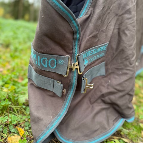 Lila Horsewear Amigo Hero 6, vuoreton sadeloimi, kokoa 165cm (UK 7,0). Kaulakappaleen paikat on. Loimea korjattu vähän, mutta edelleen käyttökelpoinen loimi. Keskellä peppua takaa korjattu yksi vekki ja laitettu vahvikepaikka. Kaulan yläosassa karhentumaa, muutoin hyväkuntoinen loimi. Ehjät soljet ja kiinnitykset.