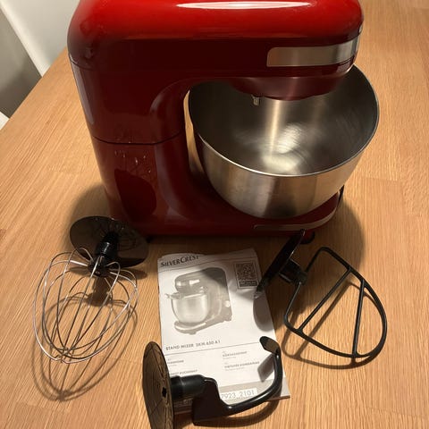 SilverCrest monitoimikone, teho 1300 wattia, punainen. Sisältää ruostumattomasta teräksestä valmistetun kulhon ja useita lisäosia, kuten vispilät ja taikinakoukut. Soveltuu monipuoliseen ruoanvalmistukseen ja leivontaan kotitalouksissa. Vähän käytetty.