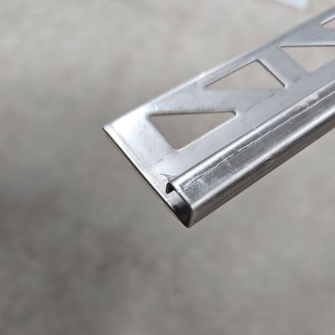 Paketissa oleva metallinen kullanvärinen sauma lattiatasolista. Pit. 90 cm, lev. 4 cm ja lattian tasoerot 0-10 mm