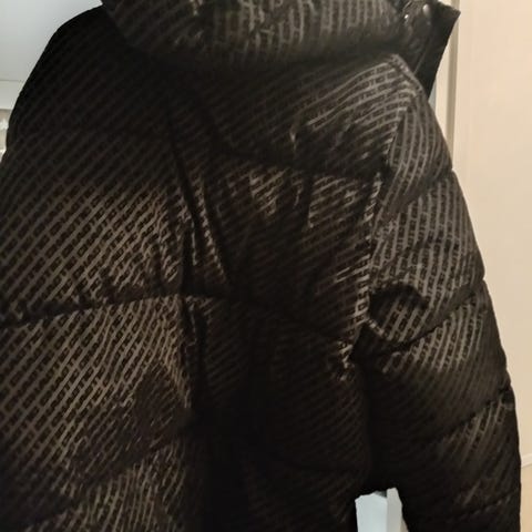 Lämmin takki irroitettavalla vuorella, ja takissa on huppu minkä saa taitettua takin sisään on lämmin takki.