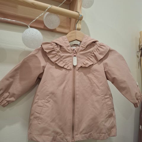 Newbie vauvan takki koossa 68, väriltään vanhanajanroosa. Takissa on irroitettava huppu, jossa irroitettava tekoturkisreunus, ja takana koristeellinen rusetti.