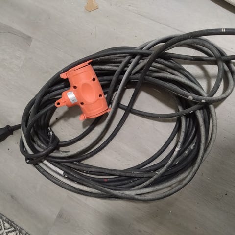 16A:n jatkojohtoja. Kahdesta 10 m:n roikan naaraspistokkeen suojaläppä "lähtenyt kävelee".