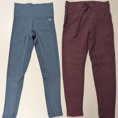 Kahdet siistikuntoiset ratsastushousut kokoa 42. Collegekangasta, värit sininen ja violettiin taittava harmaa. Hinta kaksille housuille yhteensä 20€.