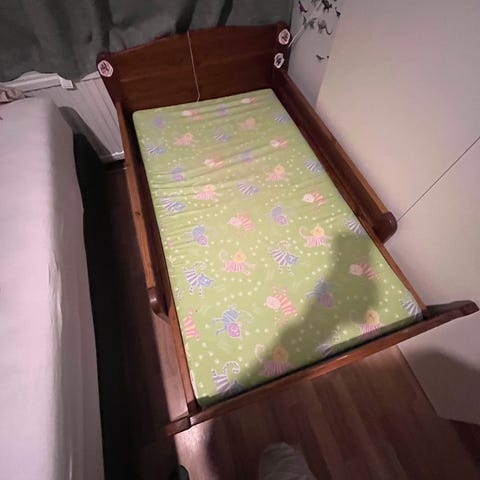 130 x 70 jatkettava lasten sänky. Ilman patjaa. Käytön jälkiä löytyy.