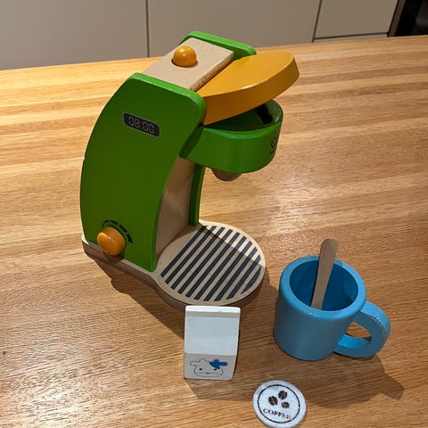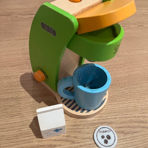 Mukaan saa ”kahvikapselit”. Ylöosan luukku avautuu. Laitteesta kuuluu äänet. Koko n. 18 x 15 x 12 cm. Leluvalmistaja: smoby.