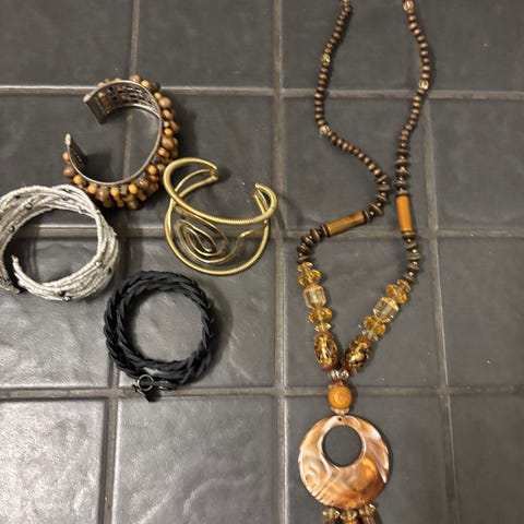 Hopeoitu korusetti naisille sisältää ketjun ja rintakorun. Materiaalina on hopeanvärinen metalli. Korut sisältävät erilaisia koriste-elementtejä, kuten kukka- ja kiekkomuotoisia riipuksia sekä kiviä ja muita yksityiskohtia.