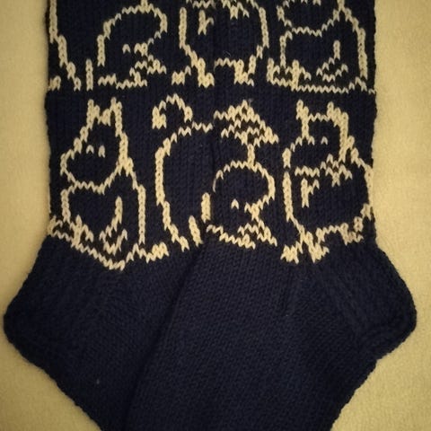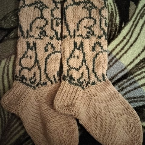 Kirkkaanpunaiset melko pitkävartiset villasukat n. kokoa 38/39. Varsissa valkoisin kuvioin halaavat Muumit. Sukan varren pituus kantapään alaosasta yläreunaan on n. 33 cm ja teräosan pituus n. 24cm. Kestää konepesun, Nalle - lanka tai muu vastaavan paksuinen.