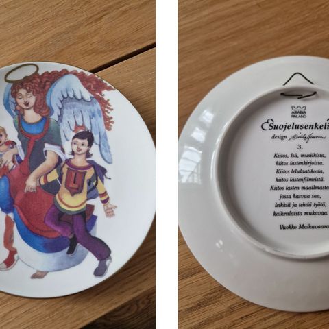 Moitteettomassa kunnossa oleva Arabian Alla enkelipasuunan seinälautanen. Suunnittelija Heljä Liukko-Sundström