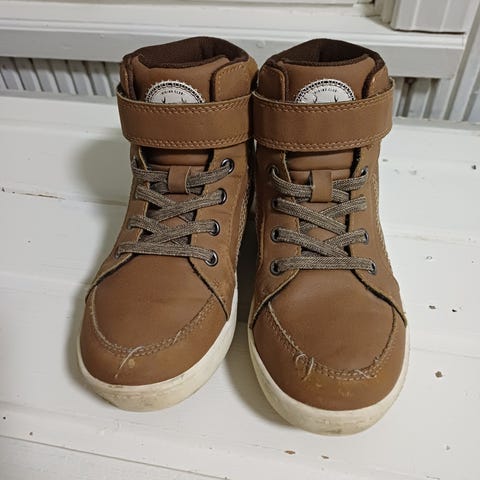 Vanhat nahkaiset lasten kengät. Kulahtaneet ja käytönjälkiä, mutta ehjät kengät.