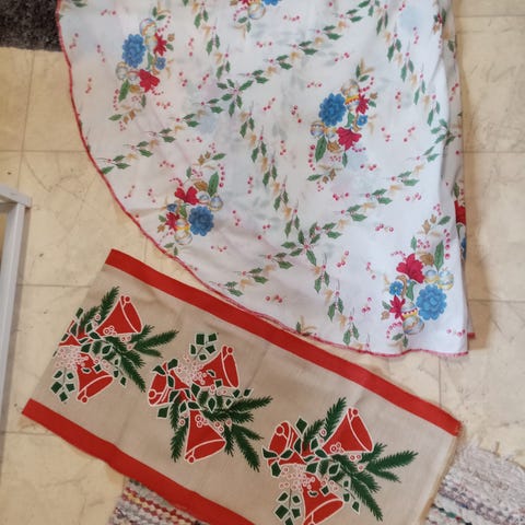 Vas.puol.Pöytäliinan leveys 27cm, pituus 88cm, ehjä 6 euroa.