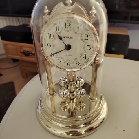 Muuten ehjä,Kullan värinen,mutta puuttuu kellonviisari nuppi.Käy aikaa.Valmistettu Länsi-Saksassa 1960.Korkeus 8,5cm/Leveys 6cm.Nouto tai jos postitus,ostaja maksaa postikulut.Hinta 45e