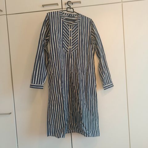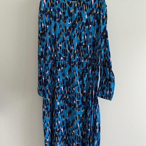 Marimekko Matkue Kaski mekko. Matkue-mekko on valmistettu viskoosikrepistä ja siinä on sinisen, tummansinisen ja beigen sävyinen Kaski-kuosi. Mekossa on väljä kuminauhapoimutus vyötäröllä, piilovetoketju takasaumassa sekä pitkät pussimaiset hihat, joissa on kuminauhapoimutukset hihansuissa sekä pientä poimutusta olalla.