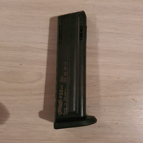 Pienoispistoolin Walther P22 22lr 10 patruunan hyväkuntoinen lipas, lupavapaa.