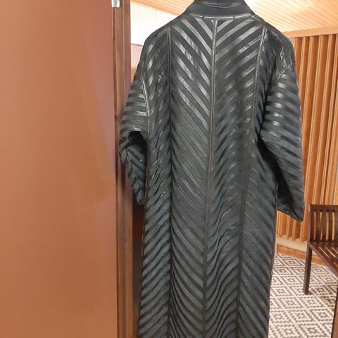 Koko: 34, mutta malli on väljä. Sopii monenlaisille vartaloille, noin XS–L -kokoisille. Kuvissa takki on kahdella eri mallilla (molemmat n. 160 cm, koot XS–M).