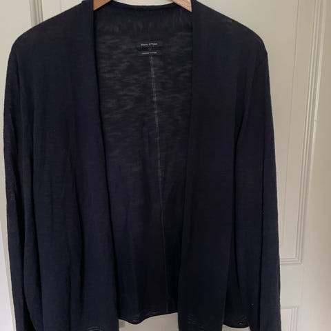 Marc O'Polon musta lyhyehkö neuletakki napituksella edessä. Neulos on ohutta, pesulappu on poistettu, mutta merkintä finest merino cotton, eli merinovilla ja puuvilla lienevät päämateriaalit. Kainalo-kainalo -mitta napit kiinni mitattuna 50 cm, joten istuva malli. Kunto on ahkerasta käytöstä huolimatta edelleen hyvä.