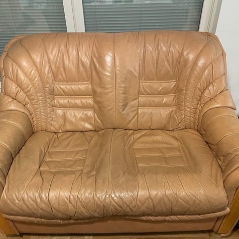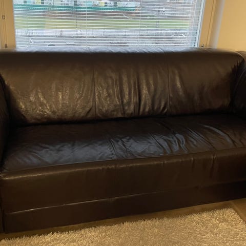 Musta keinonahkasohva, istuinosassa halkeamia jotka eivät juurikaan haittaa. Olen pitänyt istuinosan päällä mustaa ohutta villapeittoa.
