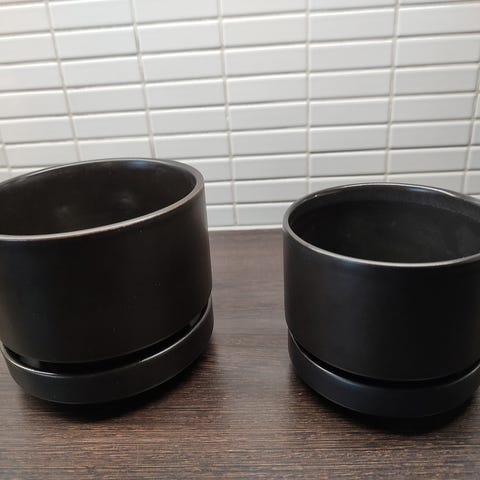 Arabian siistit SN - mallin kukkaruukut. Isompi aluslautasella, halkaisija 18,5 cm ja kokonaiskorkeus 15,5 cm. Pienempi ilman aluslautasta, halkaisija 13,5 cm.
