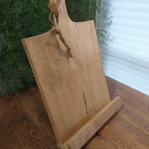 Kirjateline, valkoinen. Teline on tukevaa metallia ja pysyy hyvin pystyssä. Ketjuissa roikkuvat pallot painoina ja niiden avulla kirja pysyy auki.
