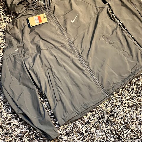 Nike juoksutakki, koko M, sininen väri. Materiaali hengittävä ja kevyt, sopii juoksuun. Takana valkoinen "JUST DO IT." -teksti. Takissa on vetoketju ja korkea kaulus. Kauluksen sisällä on huppu. Takissa on sivutaskut.