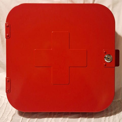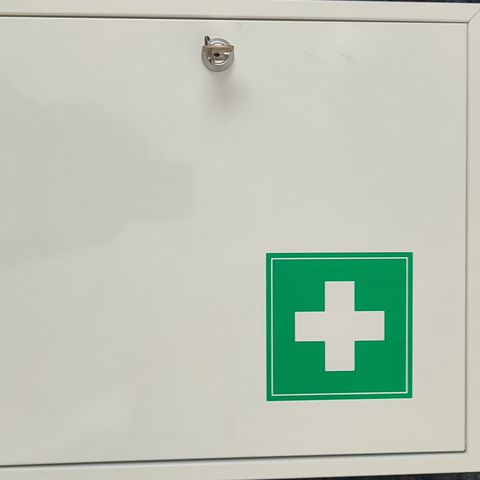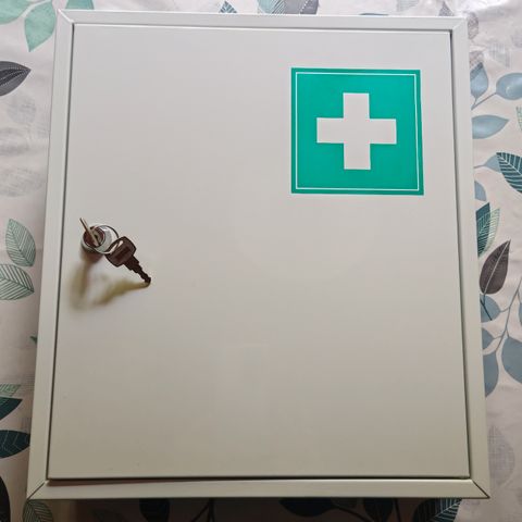 Metallinen lääkekaappi. Lukittava, avaimet tallessa.