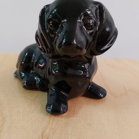 Koira patsas istuu marmorialustalla. Patsas on yksityiskohtainen ja esittää koiraa istuma-asennossa. Alusta on suorakulmion muotoinen ja marmoria.