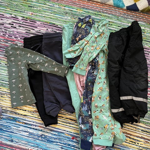 Fleecehaalari, housut, collegepaita ja sukkia.