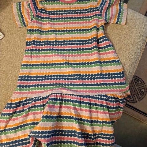 Ihana vaalea liila-vihreä raitainen Marimekon mekko. Koko 104/110. Lähes käyttämätön, mutta huomasin pienen reiän toisen taskun vieressä.