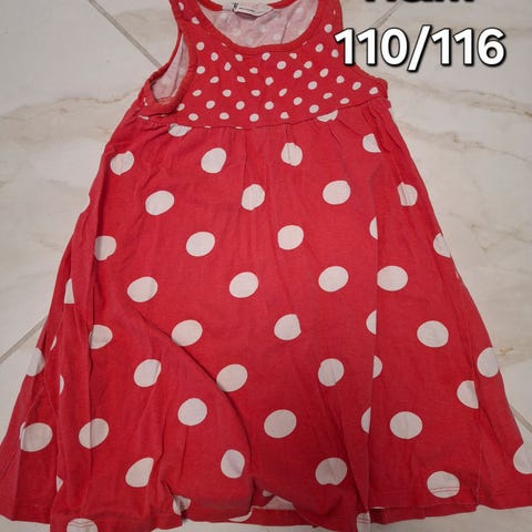 Hyväkuntoiset vaatteet: kelta-valkoraitainen pitkähihainen, tummansininen t-paita kiiltävällä perhoskuviolla ja vaaleanpunainen eläinmekko.