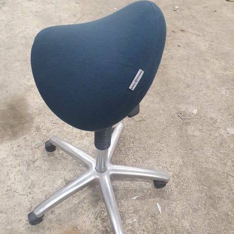 Tarpeettomaksi jäänyt hyvä satulatuoli, joka palveli muutaman vuoden kampaamossa. Nahka uusittu itse jämäkämpään nahkaan.