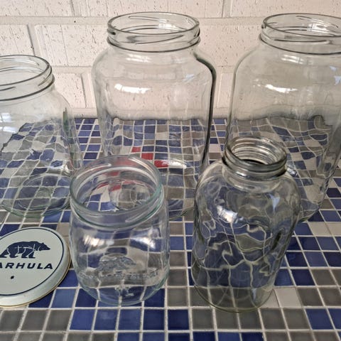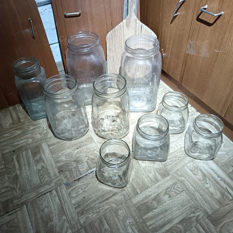 Vanhoja lasipurkkeja ja pari irtokantta. Kaikki ehjiä, osa värillisiä, kannet kolhuisia ja kuluneita mutta ruosteettomia. Kaikki kerralla tai erikseen, saa tarjota.