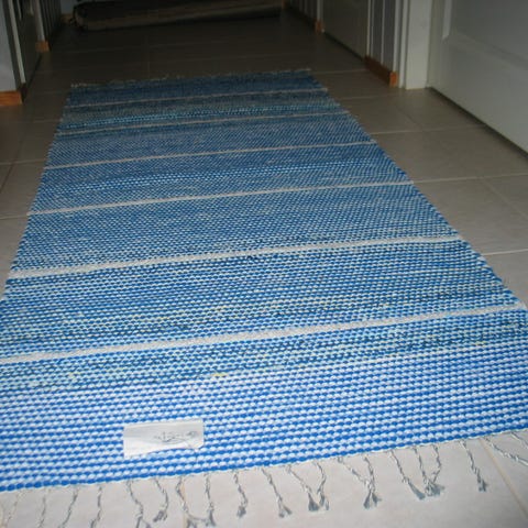 Ukrainan väreissä sini-keltainen matto, koko 74x19+7 cm. Uusi. Musta loimi.