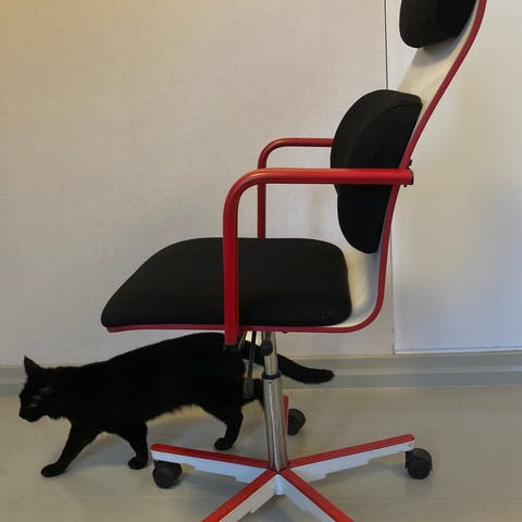 Yrjö Kukkapuron Avartelle suunnitteleman Visual-sarjan työpöytä. Pöydässä on mustat teräsjalat, valkoinen pöytälevy ja punaiset yksityiskohdat. Käytön jälkeä ja kulumaa. Pöydän pinnassa jälki, joka näkyy kuvassa. Vain nouto. Tarjoa!