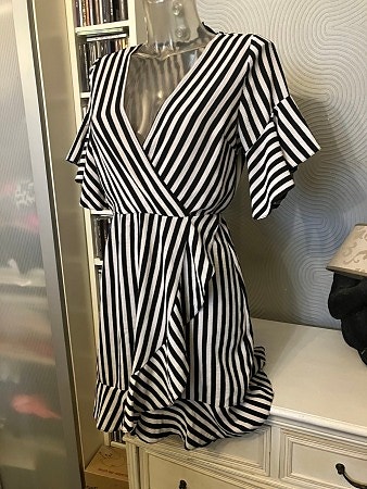 Uutta kotia etsii kuvan upea laskeutuvaa joustavahkoa polyesteriä oleva musta hame valkosiin liituraidoin