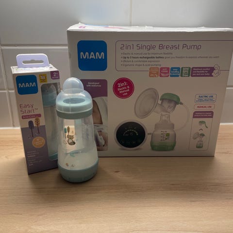 Myydään todella vähällä käytöllä ollut MAM 2in1-rintapumppu. Paketissa on siis sähköinen ja manuaalinen pumppu tarvikkeineen, kaksi tuttipulloa ja yksi purkki.