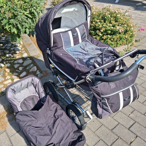 Emmaljunga yhdistelmärattaat valkoinen. Mukana myös sateensuojaa ja hoitolaukku.