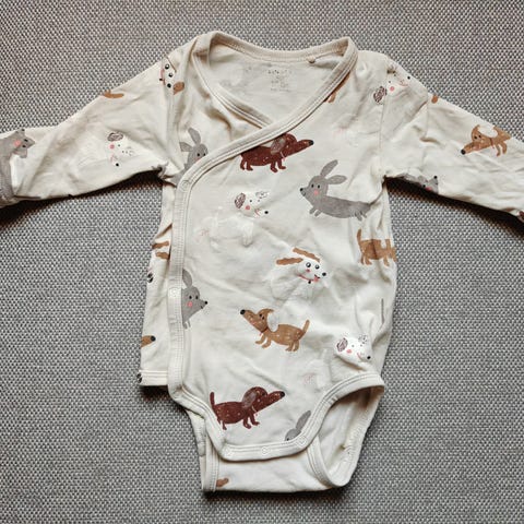 Siisti body tuplaneppareilla, koiraprintti. Vaaleansininen pohjaväri.