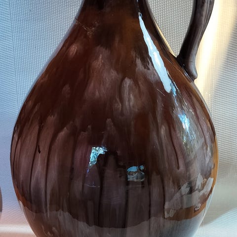 Ikäisekseen hyvässä kunnossa. Kuvissa näkyy pienet kauneusvirheet. Muutama vaalea lasitteeton piste, kahvan alla pieni viiru (ei paljoa sormelle tunnu, joten ei mikään iso kolhu) ja kahvasta puuttuu pieneltä matkalta lasite. Pohjan reunassa näyttää aivan kuin olisi pala pois, mutta päällä lasite, joten valmistusvaiheessa ollut jo. Pohjassa signeeraus