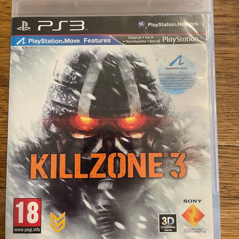 Killzone 3 Playstation 3 peli. Ikärajasuositus 18+, sisältää 3D-toiminnallisuuden ja moninpelimahdollisuuden. Pelin kansi ja levy näkyvissä kuvissa.