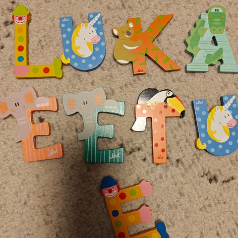 Käyttämättömät ja vielä paketeissaan olevat kirjaimet esimerkiksi lapsen huoneen oveen. Hinta yhteensä 1€.