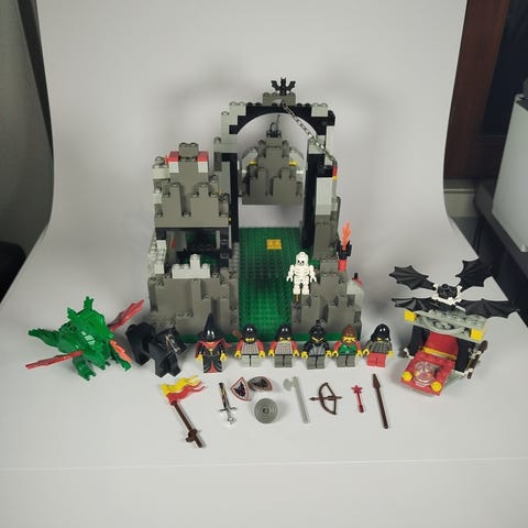 Lego Castle 6037 setti vuodelta 1997. Kaksi asetta, viitta ja 4589 trans-red osa puuttuvat. Lohikäärmeessä likaa.