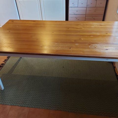 Myydään täyspuinen kuuden hengen ruokapöytä. Pöydän kansi käsitelty harmaalla kalustevahalla ja jalat valkoisella. Maalipinnassa jaloissa jälkiä mustista tuoleista ja kannessa joitakin jälkiä. Pöydän yleisilme kuitenkin siisti ja muutoin hyvässä jykevässä kunnossa. Mitat pituus 180cm, leveys 90cm ja korkeus 75cm. Koiratalous.