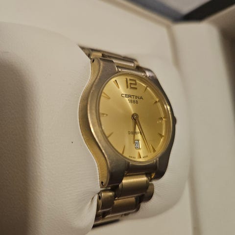 Certina naisten rannekello, jossa on musta kellotaulu ja metallinen verkkoranneke(mesh). Kellossa on päivämääränäyttö ja selkeät osoittimet. Takakannessa on kaiverrettu merkintä. Kello sopii arkipäivän käyttöön ja muotitietoiseen pukeutumiseen. Muuten kello on tip Top kunnossa mutta taka kanssa on tullut muutama ikävä naarmu. Ja kello tarvitsee uuden patterin.