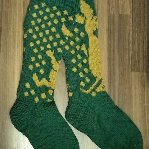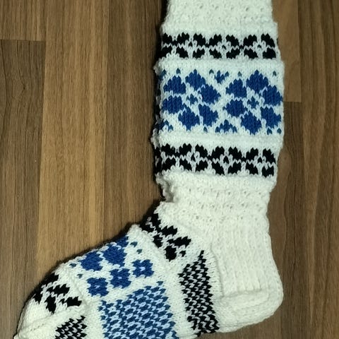 Uudet käsinkudotut, pitkävartiset villasukat noin kokoa 38/39. Kudottu konepesun kestävästä, pehmeästä Nalle-langasta (tai vastaavasta). Sukkien pohjaväri on luonnonvalkoinen, varsiin on kuvattu Hemuli. Varren pituus kantapään alaosasta yläreunaan on n. 38 cm. Sukan teräosan pituus on n. 24cm