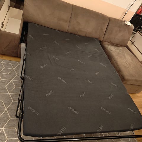 Siisti puurunkoinen vuodesohva levitettynä patjojen koko 190x140cm. Vuodevaatelaatikko. Patjat ja tyynyt sisältyy hintaan. Koiratalous, savuton.