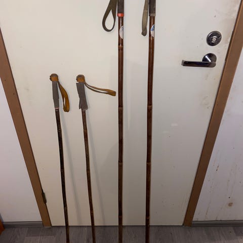 Vanhoja eri pituisia Rottinki sauvoja. Sauvojen pituudet:n.110cm,n.125cm ja n.135cm.näissä kaikissa muovi sompa. Hinta 10e/pari tai kaikki kolme paria 15e.
