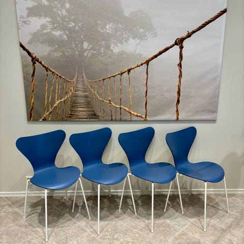 4 kpl Fritz Hansenin seiskatuoleja. Ok kuntoisia, kulumaa kuitenkin löytyy.