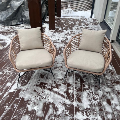 Hyväkuntoinen ja siisti polyrottinkinen nojatuoli ja rahi.