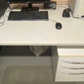 Laatikosto ottanut reilummin osumaa, mutta pöytälevy hyvässä kunnossa; hyvin pieniä käytön jälkiä vain. Levy on 4 cm paksu ja materiaaliltaan pinnoitettua lastulevyä. Takareunassa tarrakiinnityksen jämiä valonauhan jäljiltä.
